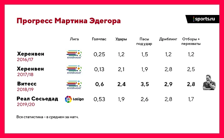 Статистический прогресс важен, ведь именно слабые цифры – при внешне эффектном стиле, – предъявляли Эдегору прежде всего. Два года назад он уже неплохо играл в «Херенвене», но этого не замечали из-за слабой результативности. Мартин проработал мускулатуру и координацию, увереннее заиграл в плотной борьбе; тогда же его перевели с центра на правый фланг, и в этой новой роли норвежец расцвел. Он в два раза чаще бил, легче уходил от защитников и активнее обострял, но не смог конвертировать все это в голы. Сезон он закончил с тремя результативными баллами (2+1).
