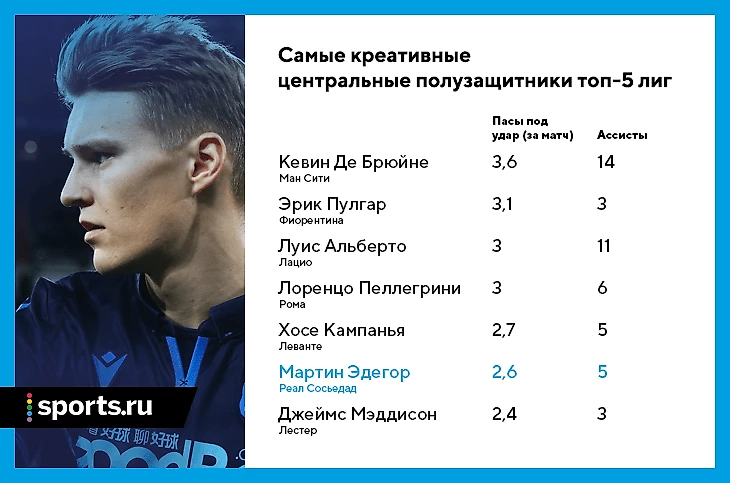 Сид Лоу из The Guardian почти не преувеличил, когда осенью назвал Эдегора лучшим полузащитником Ла Лиги. Он замыкает пятерку главных ассистентов Испании, входит в топ-3 лучших дриблеров и тащит «Реал Сосьедад» в еврокубки. В сентябре его назвали игроком месяца в Примере. По итогам первого круга Мартин попал в топ-5 по оценке Whoscored; она хотя и представляет собой чуть продвинутый подсчет технико-тактических действий, но в этом, пусть и ограниченном, смысле вполне полезна – показывает, насколько норвежец хорош с мячом.