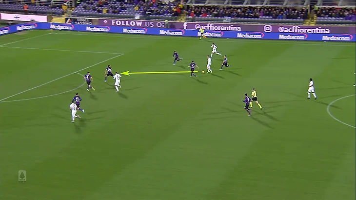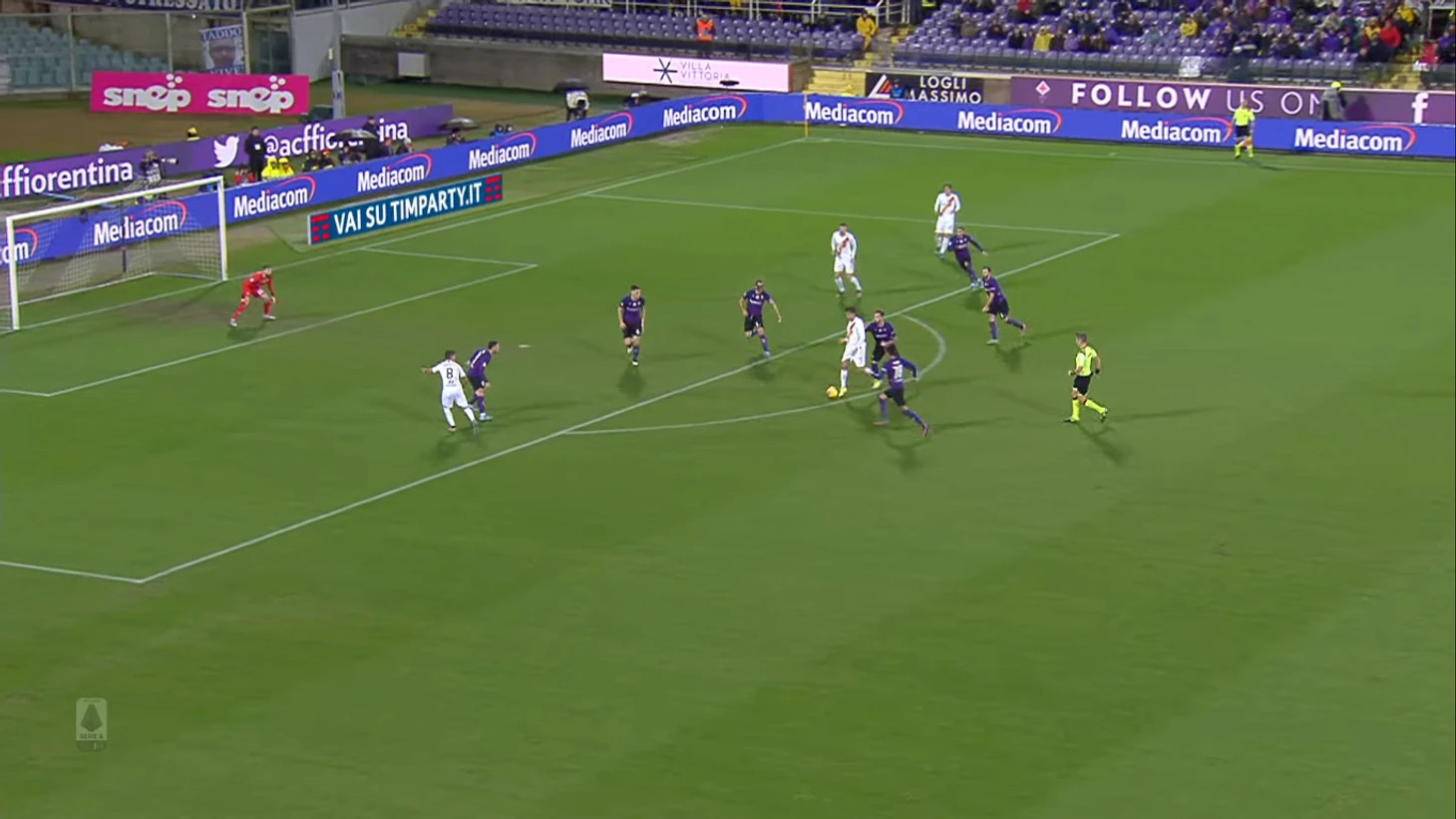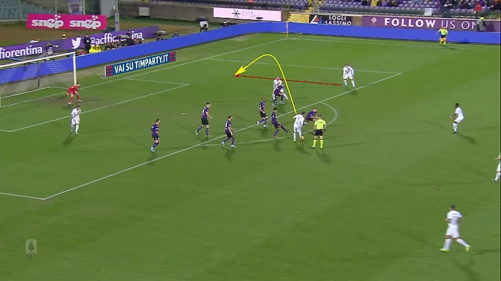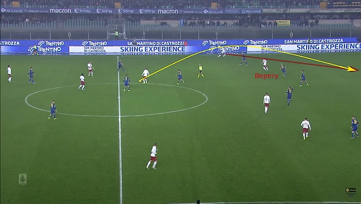 Пример такого движения Пеллегрини. Опорник Верету поднялся вверх, и Лоренцо опустился в его зону под пас из глубины. В поле зрения Пеллегрини – три свободных игрока, но вместо безопасного паса он вторым касанием разрезал оборону технически сложным забросом. Клюйверт выбежал один на один и забил.