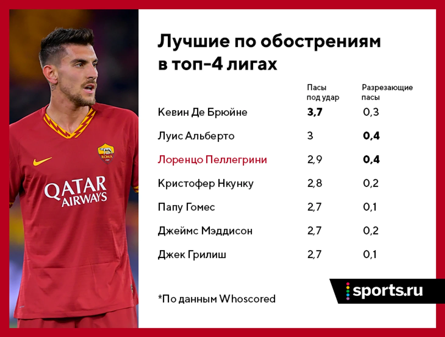 Трекварти дала Пеллегрини свободу интерпретации на всех уровнях – в движении, риске и выборе позиции. Римлянин сделал 10 голевых в 24 матчах во всех турнирах, отдает 0,44 ассиста за игру в Серии А – выше Недведа и Верона в их лучших сезонах, – и входит в европейский топ по количеству обострений. Он третий по пасам под удар и второй после Месси по разрезающим в топ-4 лигах.