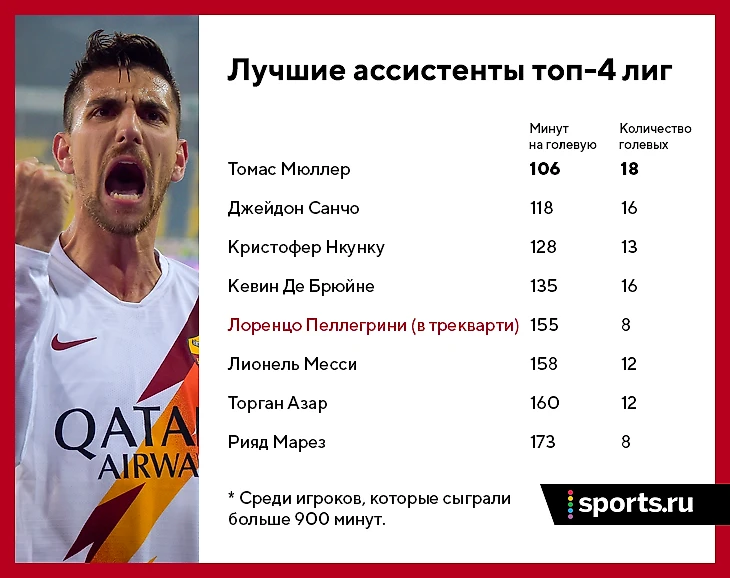 Еще внушительнее статистика Пеллегрини выглядит, если отбросить 3 матча в опорной зоне. В трекварти он отдает голевые каждые 155 минут. Мало кто взламывает оборону чаще.