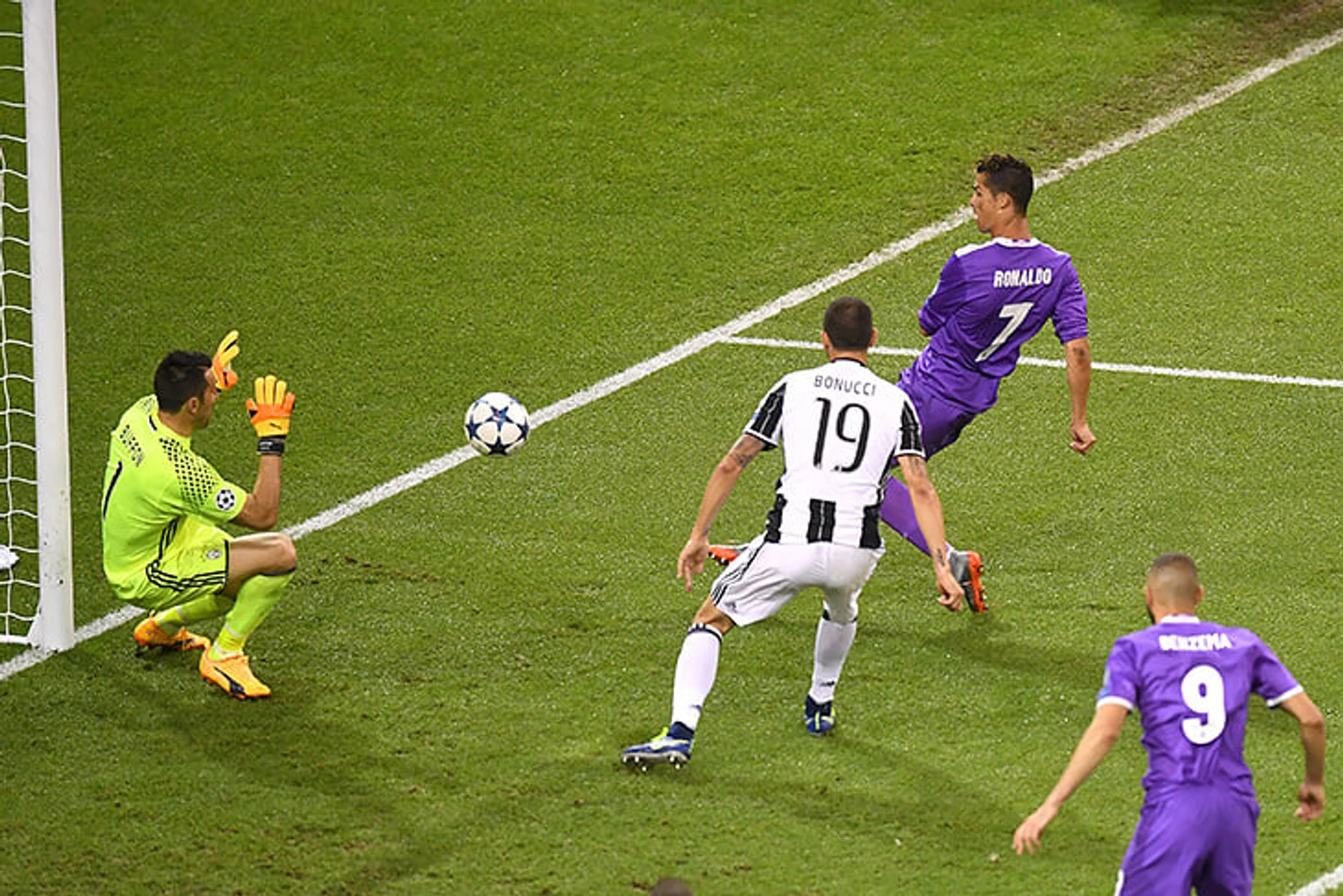 Роналду предстоял худший кошмар топ-форварда – встреча с Кьеллини, Бардзальи и Джиджи. «Юве» пропустил 1 гол в 6 матчах плей-офф. Буффон претендовал на «Золотой мяч». Но на 21-й минуте Роналду запустил Карвахаля по флангу, получил обратный пас и в касание переправил в угол. А во втором тайме открылся под кросс Модрича и тоже в касание добил «Юве».