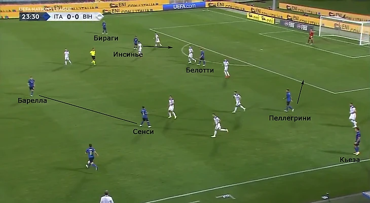 Италия защищается в 4-3-3, но это не слишком важно – она сейчас редко защищается. Куда важнее, как она атакует. В позиционном владении Манчини перестраивается в 3-2-5. Игра заточена на взлом тоннелей – вертикальных коридоров между центральным и фланговым защитниками соперника. Массированная атакующая линия мешает сопернику скомпоноваться: левый фулбек и правый вингер играют максимально широко и растягивают оборону, увеличивая пространство в тоннелях. Связка полузащитников (обычно Верратти и Жоржиньо, с Боснией – Сенси и Барелла) выдергивает защитников долгим коротким перепасом – и вскрывает появившиеся разрывы.