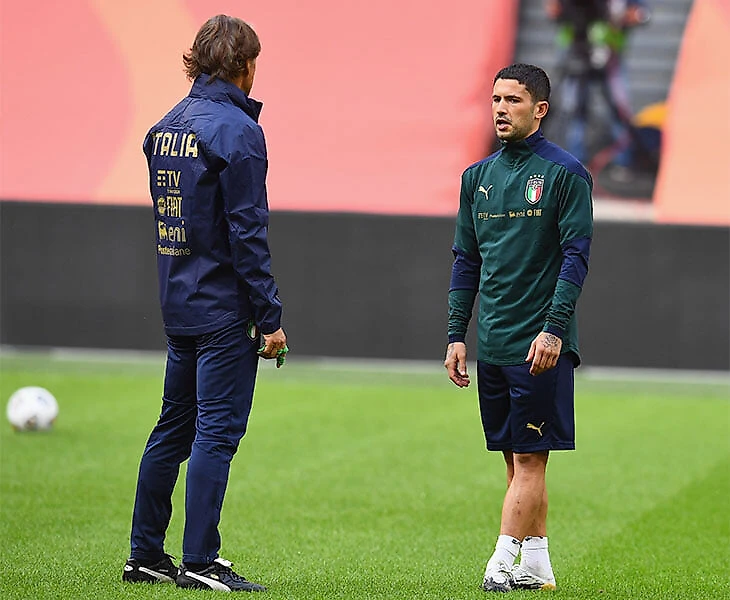 Важно, что Чиччо полезен и без мяча. Массированное атакующее владение Манчини уязвимо после потери. Быстро перестроиться и вернуться в защиту из 3-2-5 невозможно, и потому система подразумевает моментальный возврат мяча – без него Италию просто разорвут. Капуто в «Сассуоло» отвечает за превентивный интеллектуальный прессинг – не гонится за возвратом любой ценой, но занимает позицию так, чтобы направить владение соперника в нужную зону. Это не так впечатляет, как агрессивный прессинг Белотти (самый отбирающий центрфорвард Серии А), но намного лучше нулевой активности Чиро Иммобиле – лациале даже забивает меньше, если тратит силы на отбор.