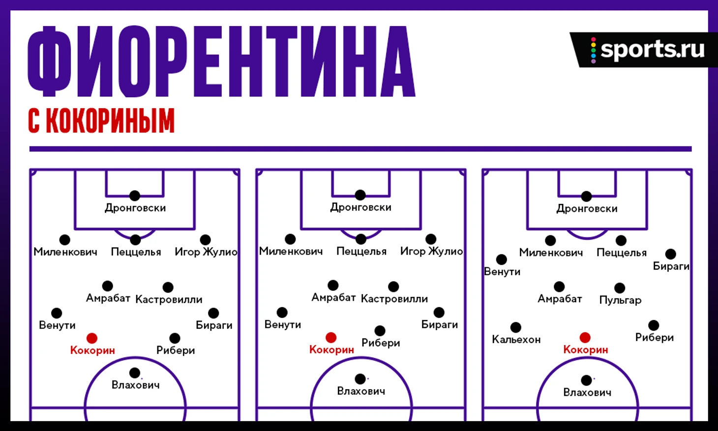 Кокорин увеличивает тактическую вариативность. С ним у «Фиорентины» больше простора для переключения схем – можно перейти на 3-5-2 и 4-2-3-1 (хотя здесь сложнее: защита настроена на игру в три). При этом вариант с двумя нападающими подходит новичку больше всего. В других модулях серьезная конкуренция, а в 3-5-2 Александр – единственный выбор на роль второго форварда. Остальные просто не сочетаются с Влаховичем.