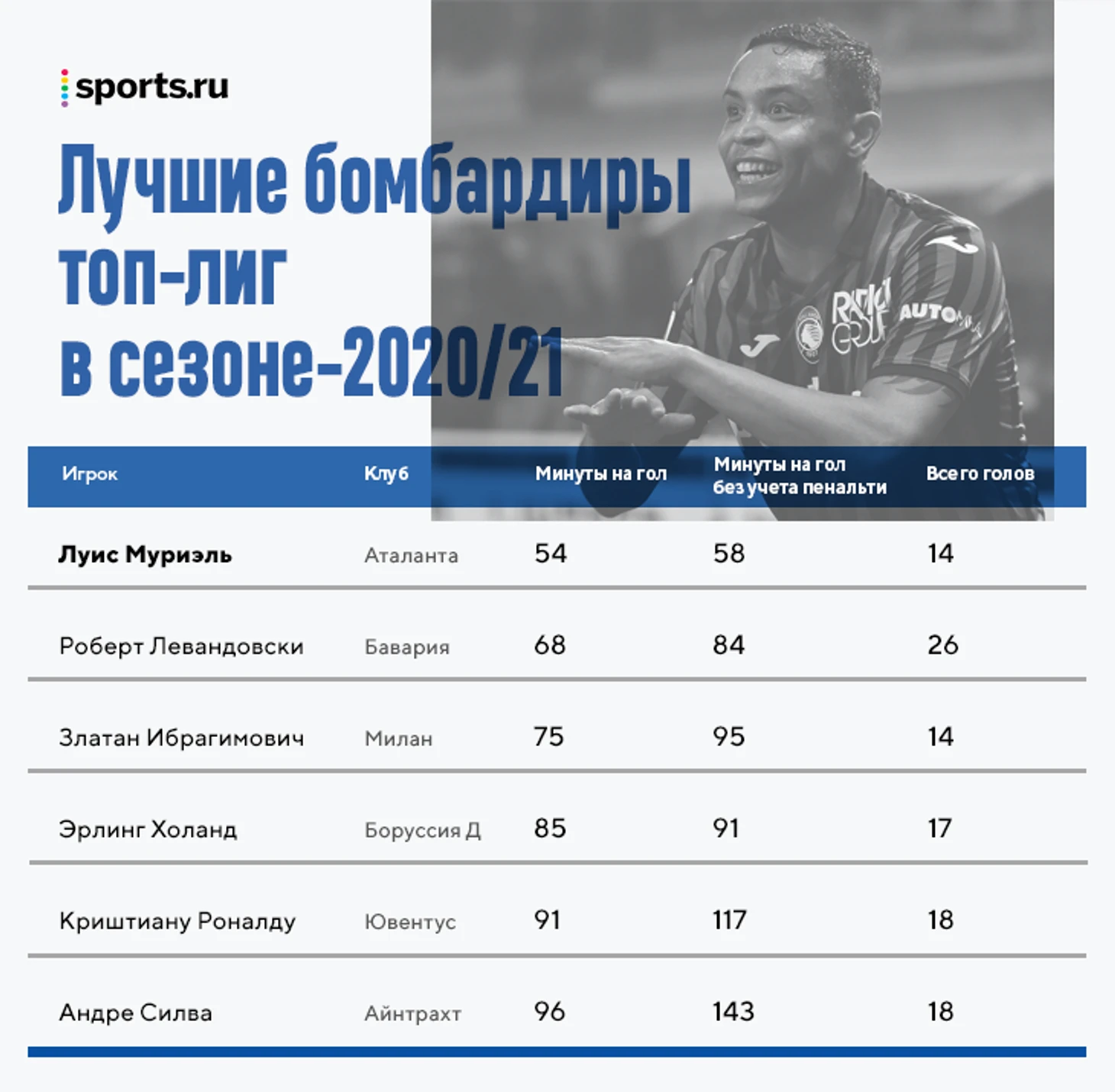 Самый эффективный бомбардир 2020-го – Муриэль из «Аталанты». Он обводит вратарей и забивает суперголы каждые 54 минуты