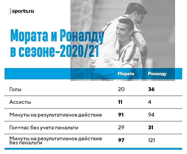 Рон и Мората забивали с игры каждую 81 минуту. Без португальца Альваро отличался каждые 96 минут, и пусть на дистанции цифры уменьшились бы, зато добавились голы условного Дибалы. Даже с худшим раскладом статистика выходит лучше, чем у Криша с Моратой, а значит, жертва принесла выгоду только приме – «Юве» не получил прибавки голов.