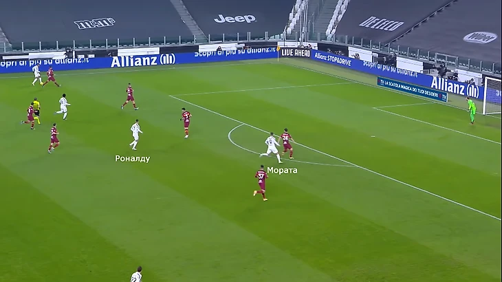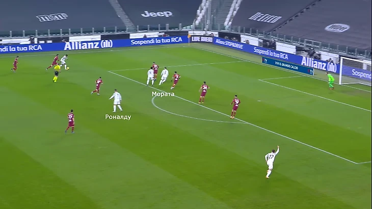 Мората делает рывок и ломает линию обороны. Защитники замечают это и вынужденно опускаются ниже. Криштиану остается один между линиями.