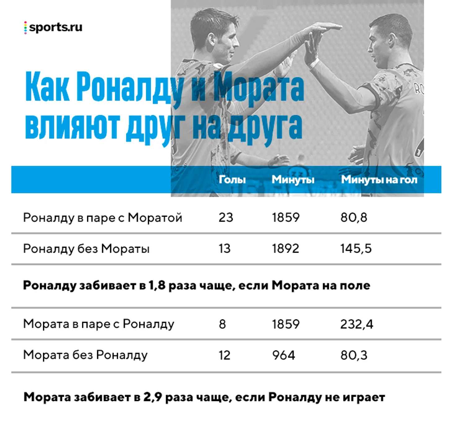 Вот этот тезис, а также промелькнувшая в тексте мысль о том, что Мората точно отдаст голевые на других игроков (не Роналду) в большом количестве - это вообще как работает? Какие-то предположения в угоду текста, ей-богу. Если "добавятся голы условного Дибалы", так приведите статистику, где, играя в паре Мората-Дибала, последний начинает забивать больше. Если Мората точно отдаст голевых на других партнеров больше, то где строчка в графике о голевых передачах на не Роналду без Роналду на поле?