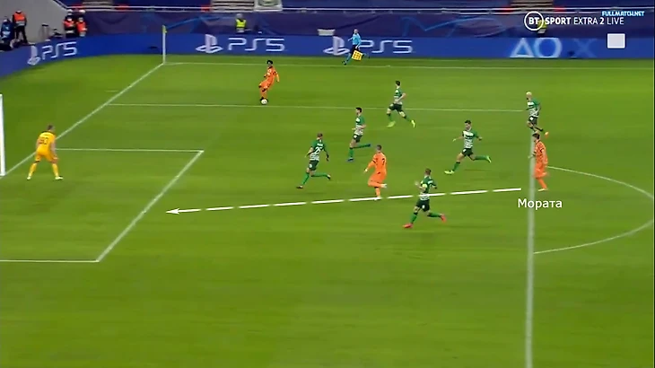 Мората заметил, что Рону некуда убежать, и сменил вектор движения: к центру, а не от него. На полуфланге появилось пространство для забегания португальца.