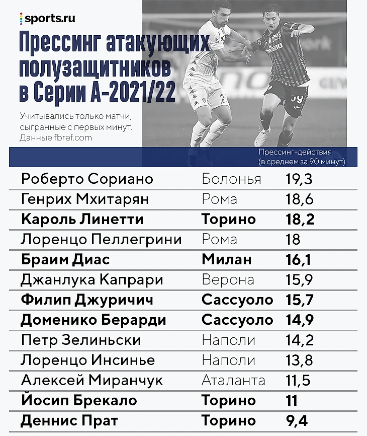 Недостаток этого варианта – в очень атлетичном стиле «Торино». Юрич навязывает соперникам маскулинный динамичный футбол, разбивает игру на персональные дуэли, войну характера и тестостерона, и все это не очень подходит Миранчуку. Но ему все равно придется меняться. Алексей – один из худших треквартист Серии А в работе без мяча. Далеко не все итальянские клубы позволяют созидателям отдыхать, и если не адаптироваться под другие требования, список сужается до предела.