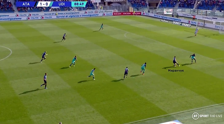 В этом плане показателен эпизод в концовке игры с «Удинезе». Миранчук перехватил неудачный пас и остался один на один с центрбеком. Слева вбегал Муриэль, оттягивая второго центрбека, а между ними зиял пустой центр.