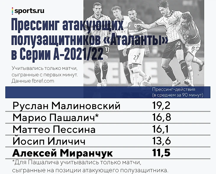 Осенью Миранчук дважды появлялся в основе и сделал 12 прессинг-действий за 94 минуты. В прошлом сезоне цифра была выше, но объясняется аномальными 24 попытками за 63 минуты с «Вероной». В остальных матчах в старте Алексей показывал аналогичные цифры – 10,9 действия за полтора часа.
