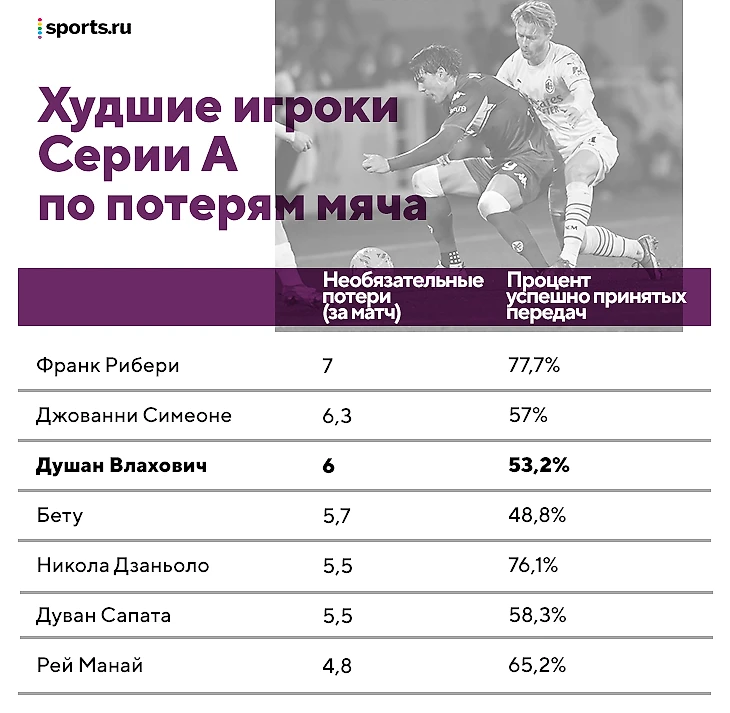 Плохая обработка и все еще слабая правая делают Душана предсказуемым и стилистически однообразным. Он глохнет, если получает мяч под правую ногу, слаб в приеме спиной к воротам и главное – в точности первого касания под прессингом. Влахович делает 6 необязательных потерь за матч (необязательные – потому что совершены либо без активного действия, либо из-за плохого контроля). Хуже только Симеоне и Рибери.