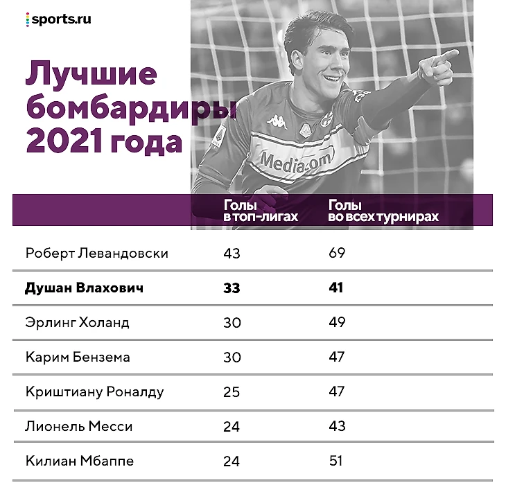 Душан Влахович влетел в элиту со скоростью истребителя. Прошлой зимой о нем знали только любители Серии А. Сегодня он один из самых эффективных нападающих мира. 21-летний серб поставил рекорд «Фиорентины» по голам за календарный год, забил 18 мячей в 21 матче в новом сезоне и сделал 5+2 в 7 осенних играх за сборную. Он скопил 41 гол за 12 месяцев – и стал седьмым бомбардиром планеты и вторым в топ-лигах. Только Левандовски забивал чаще.