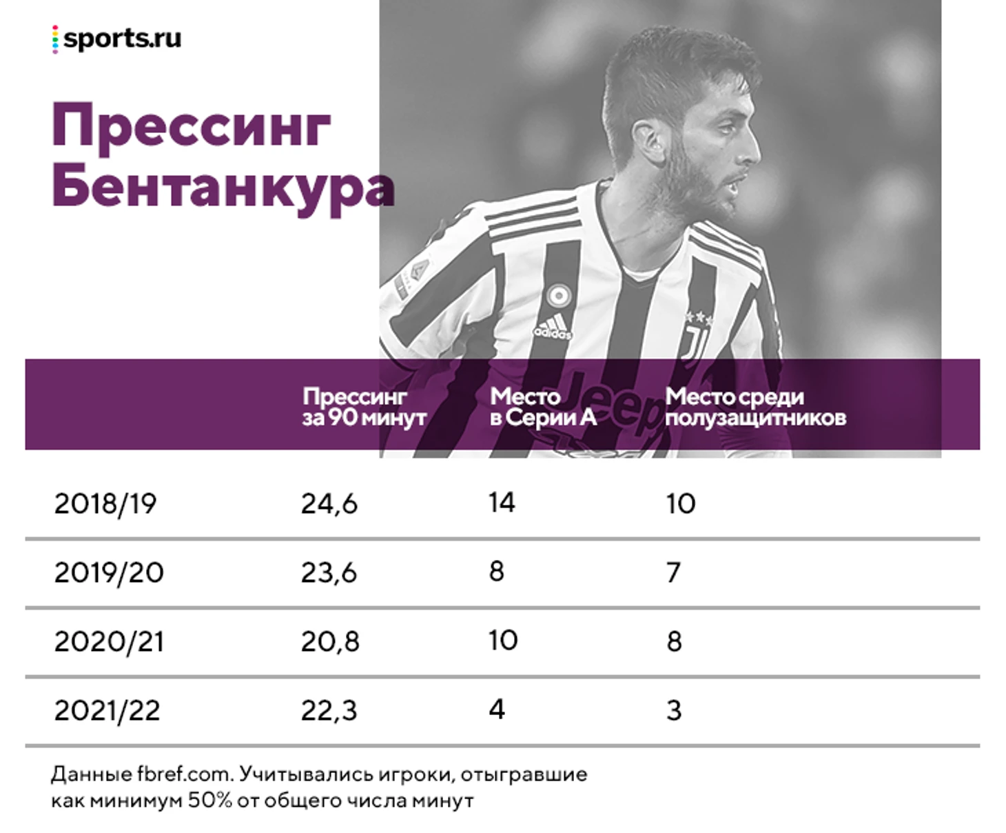 Это делает его очень неполноценным бокс-ту-боксом. Что еще хуже, любое другое применение исключено. Бентанкур играет только восьмеркой или вторым опорником. И дело не в том, что статичные роли скрадывают потрясающую мобильность. У него пробелы в базовых навыках. Уругваец не контролирует положение соперников и плохо позиционирует тело перед обработкой мяча. Из-за этого он катастрофически уязвим на приеме и непригоден к ролям, связанным с плотной опекой – то есть к игре перед защитой или под нападающими. Понятно, что Родриго теряет мяч далеко не всегда (в прошлом сезоне был лидером клуба по пасам под давлением), но именно он чаще всех подводил «Юве» при серьезном прессинге.
