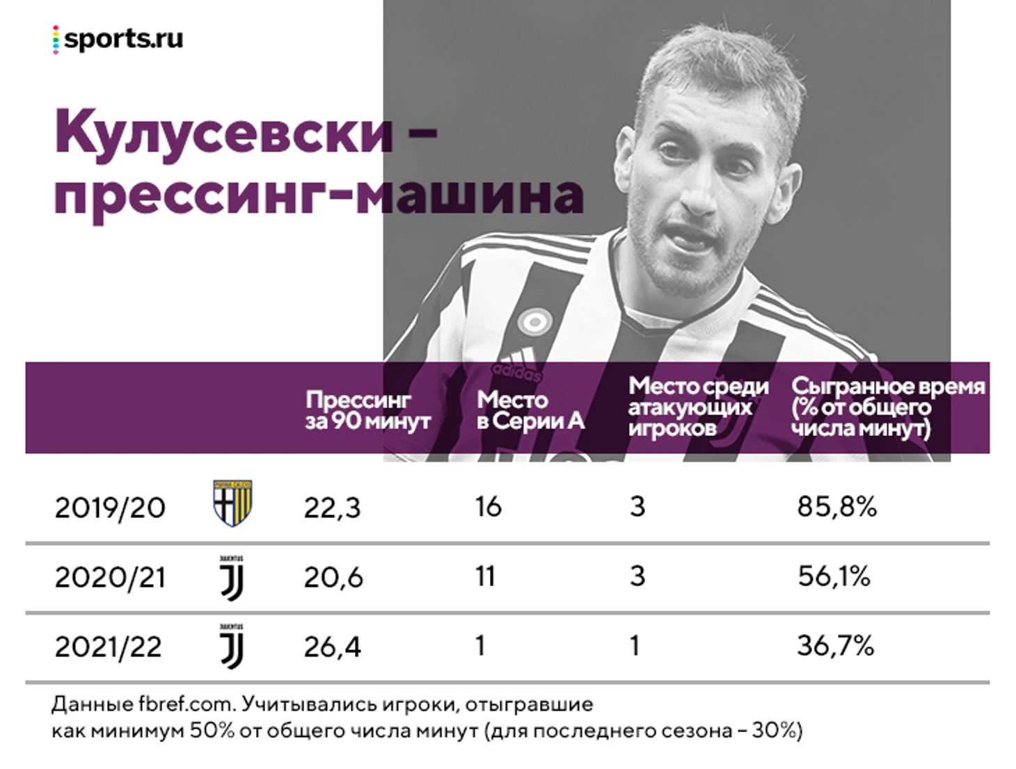 Кулусевски сочетает пахоту с обострением лучше большинства игроков топ-лиг. Это настоящий дар. Пармский сезон-2019/20 (последний, отыгранный в старте) он закончил в десятке лидеров лиги по пасам под удар, предголевым и предударным действиям, результативным передачам, ожидаемым ассистам, продвижению мяча дриблингом и общему числу прессинг-действий. Ему было всего 20. Сейчас он третий год подряд держится в тройке самых прессингующих атакующих игроков Серии А – причем только он не выпадал из топа.