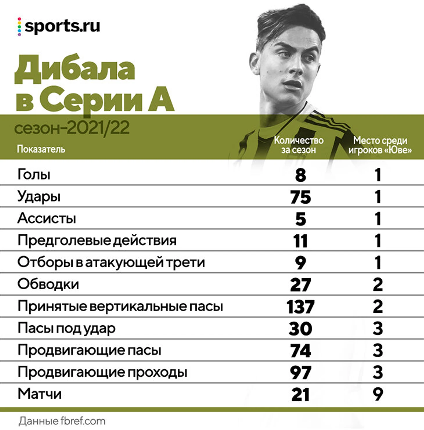 Второй нюанс возвращает к уникальности аргентинца. Даже в состоянии перманентного набора формы Дибала – самый продуктивный игрок «Юве». Он лидер клуба по голам, ассистам и предголевым действиям, в тройке по пасам под удар и продвижению мяча, в топе по дриблингу и высоким отборам. В абсолютных, а не относительных цифрах, так что на травмы поделить нельзя.