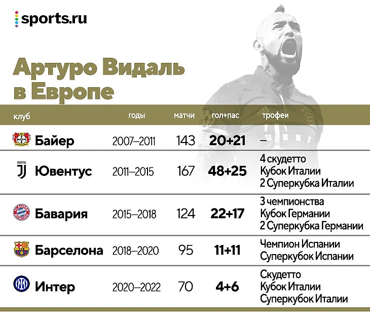 Когда Видаль был подростком, будущий тренер чилийской сборной Клаудио Борги пророчил ему славу лучшего либеро планеты. Либеро исчезли, и Артуро стал неплохим латералем. В Леверкузене Михаэль Скиббе переделал его в опорника, а когда травмировались форварды, перевел в нападение. Чилиец блистал везде. В 2018-м Бундеслига включила его в сборную «Байера» всех времен – в одну линию с Кроосом и Баллаком.
