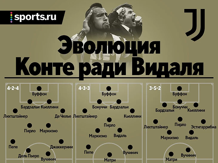 «Видаль – поразительный игрок. Но поначалу мне сложно было встроить его в «Ювентус», – вспоминал Конте. – Я планировал схемы 4-2-4 и 4-4-2, но увидев, как мощно Видаль носится вперед-назад, переключился на 4-3-3. Потом они превратились в 3-5-2. Я сменил модуль, когда понял, насколько Артуро важен».