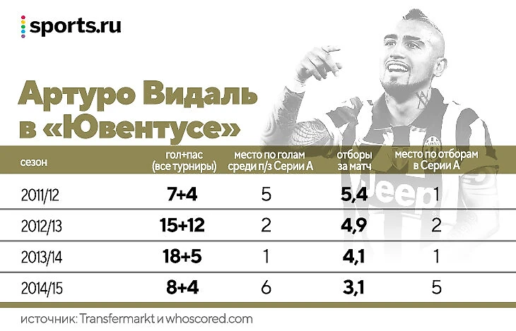 Насколько конкретно он был хорош? Видаль дважды подряд попадал в команду сезона в Серии А, угодил в сборную Европы-2013/14 по версии ESM (ассоциация спортивных медиа) и стал одним из главных игроков десятилетия в «Юве». В 2013-м Goal выбрал его лучшим полузащитником континента. Видаль обошел Бэйла, Швайнштайгера, Иньесту и Мату.