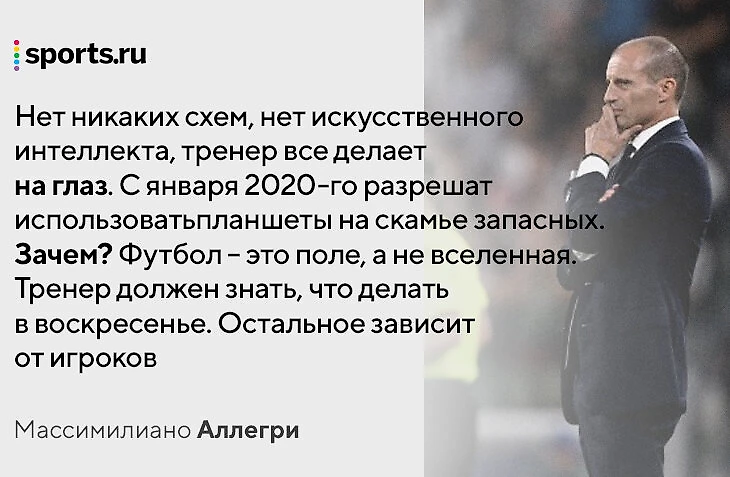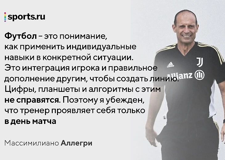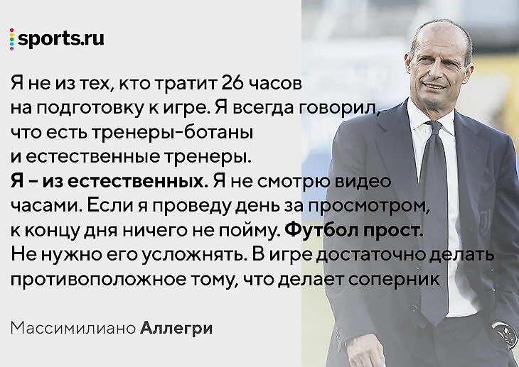 2. В этой фразе важна трактовка: можно подумать, будто Аллегри не готовится к матчам, но это не так. Он объясняет лишь, что его подготовка интуитивна и зависит от прозрений. Гигабайты видео и аналитических данных только запутывают. Нужная идея приходит сама: