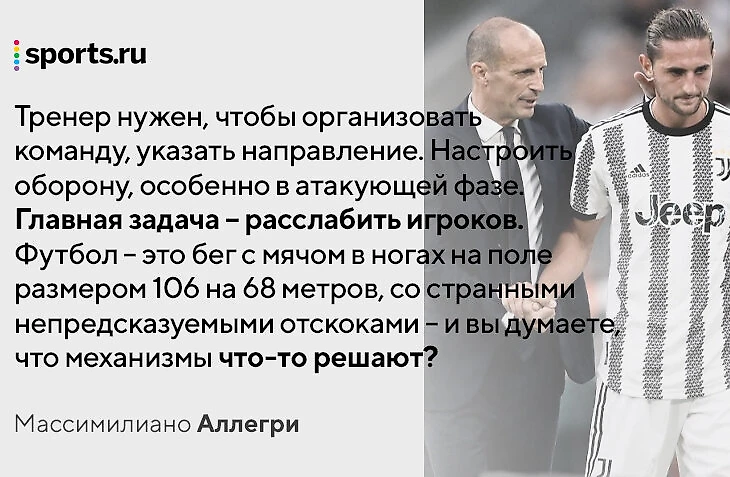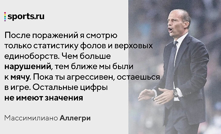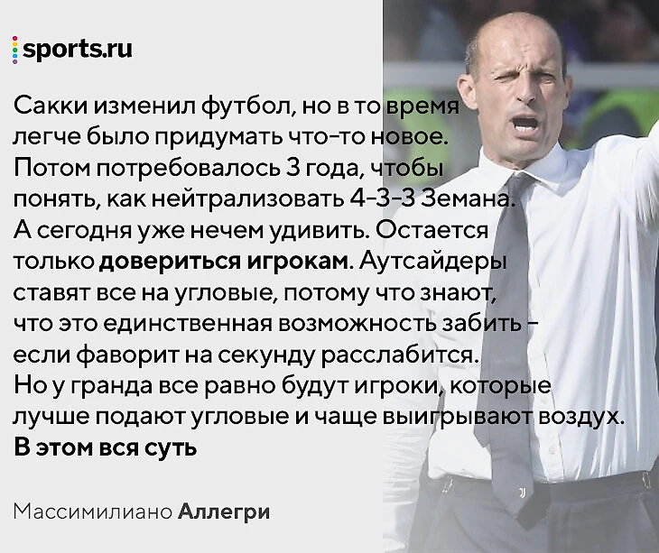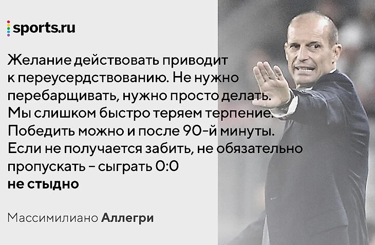 Еще раз: это не критика. Футбол прекрасен многообразием, и подход Макса ничем не уступает любому другому. Побеждать можно по-разному. Но Аллегри настолько принципиально противостоит современной игре, что возводит безыдейность в догму. И проблема не в том, как он видит игру, а в том, что не хочет видеть ее никак иначе – даже если его методы не работают.