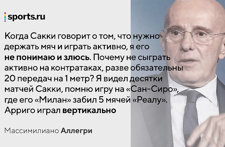 6. Сакки – постоянный критик Аллегри и его пассивной игры. Ответ Макса прекрасен подменой понятий (он любит такие софистические приемы). Сакки никогда не говорил, что футбол не должен быть вертикальным – лишь объяснял, что сильная команда должна навязывать свои правила: прессинговать, быстро возвращать мяч, давить. Аллегри противопоставляет собственное видение активной игры: закрыться в защите и жалить быстрыми выпадами, пользуясь ошибками соперника.