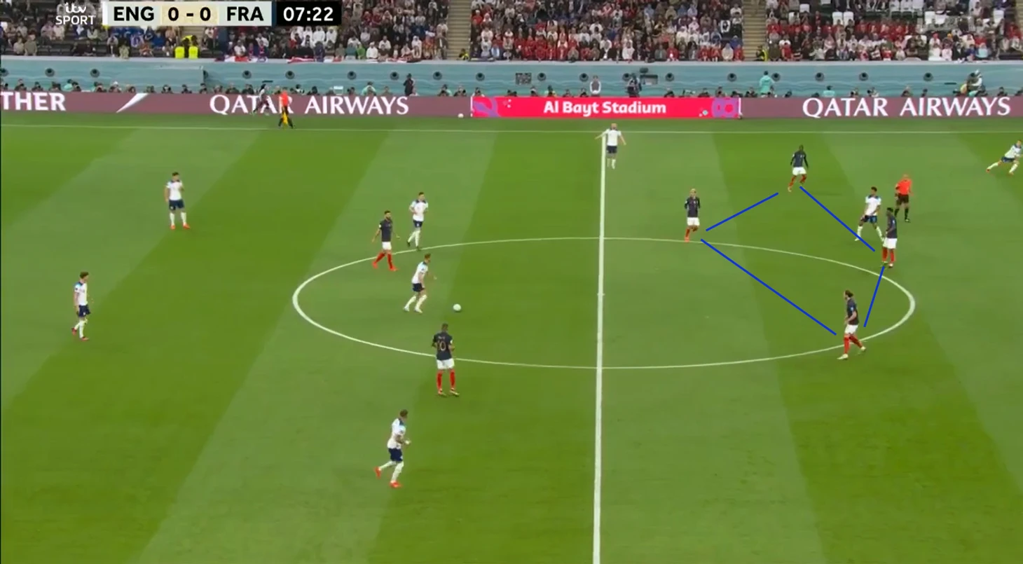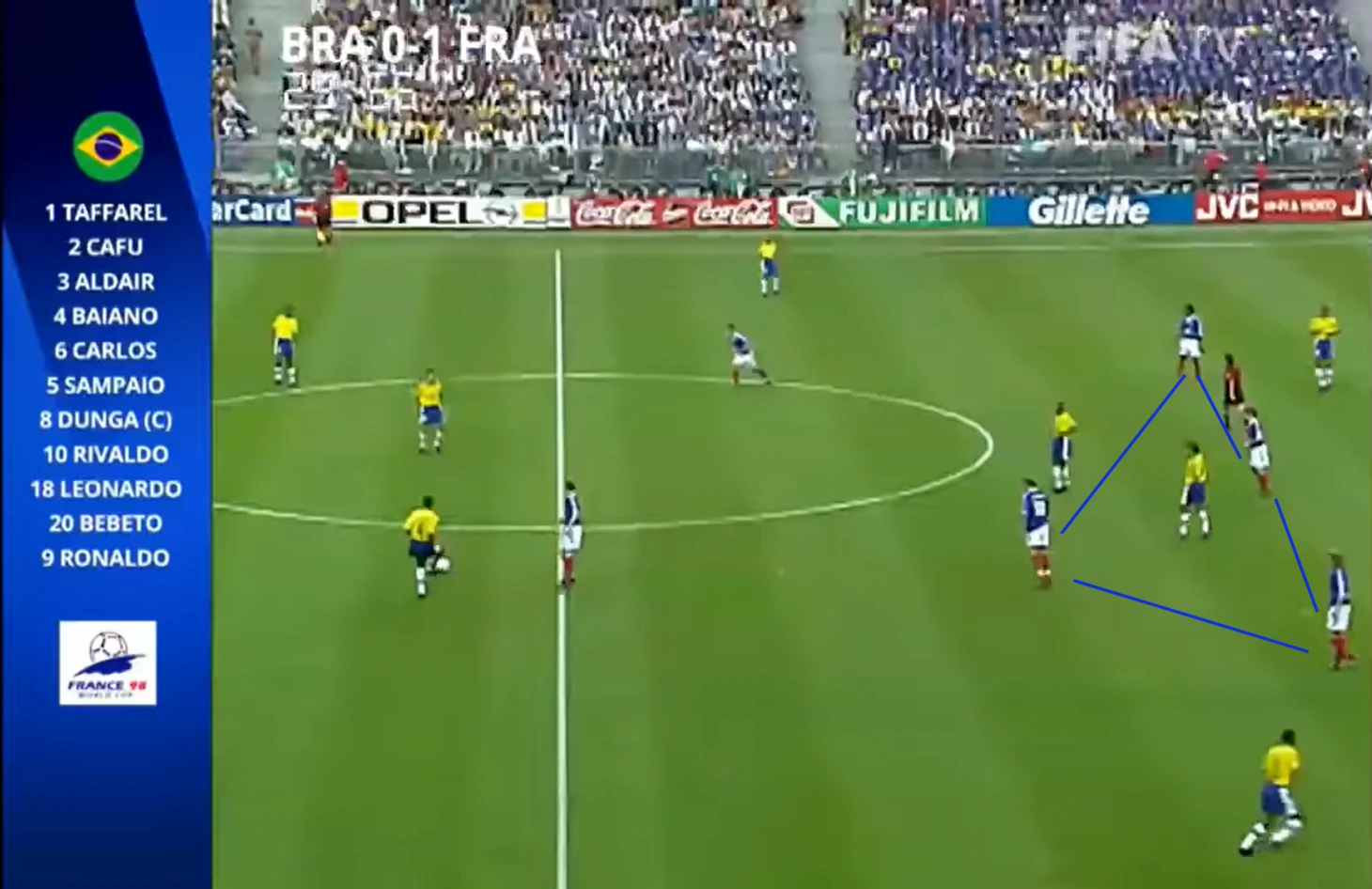 Жаке выстроил игроков в 4-3-2-1, которая иногда превращалась в 4-3-1-2 с ромбом в центре и активным персональным прессингом. Французы перекрывали полуфланги и плотно насыщали опорную зону, выдавливая соперников на края – а там навязывали индивидуальные дуэли с атлетичными восьмерками и фулбеками. Дисциплина была безупречной. Команда никогда не теряла компактность. На ЧМ она пропустила 2 гола – и только один с игры.