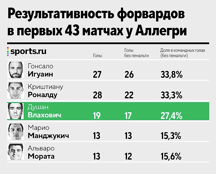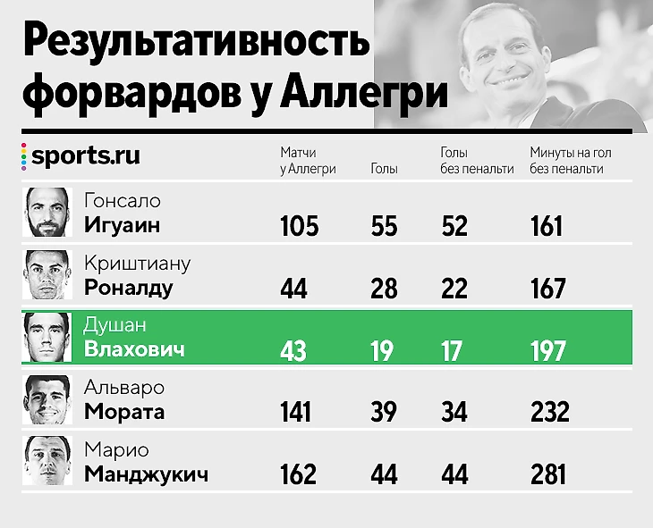 Иначе говоря, по меркам упадочного Аллегри серб достаточно эффективен. Из всех предшественников только Игуаин выдержал бы его темп. Роналду, Мората и Манджукич забили бы еще меньше.