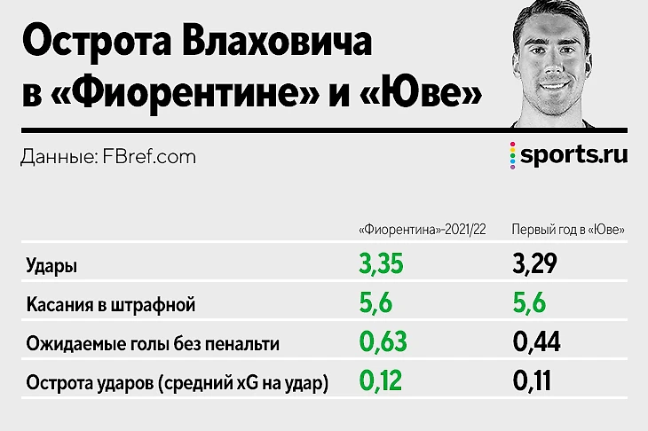 Чисто статистически вовлеченность Душана осталась на прежнем уровне. Он делает те же 5,6 касания в штрафной за 90 минут, что и в «Фиорентине», и даже бьет практически так же часто. Но количество ожидаемых голов значительно снизилось. Команда доставляет мяч ударному форварду кое-как – без правильной подготовки и в неопасные зоны.