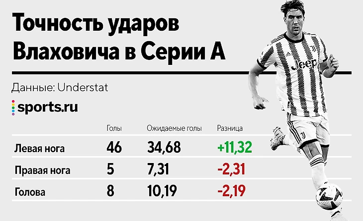 «Фиорентина» гораздо лучше адаптировалась к ограниченности Душана. Он наносил неудобными частями всего треть всех ударов – 1,1 из 3,35 за 90 минут. В «Ювентусе» все иначе. Плохо структурированная атака с миллионом навесов ставит серба в невыгодное положение. Команда сует мяч вперед наудачу, не примериваясь к бьющей ноге. Половину ударов (1,6 из 3,29) Влахо наносит головой или неудобной правой.