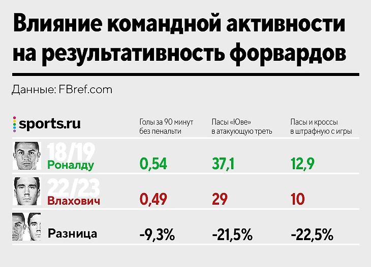 В этих условиях Влахович делает все возможное. Взгляните на разницу между командной активностью и личной результативностью. «Ювентус» атакует на 22% реже, но Влахович отстает от Роналду всего на 9,3%. Душан обеспечивает положительную разницу. По крайней мере, по сравнению с Криштиану.