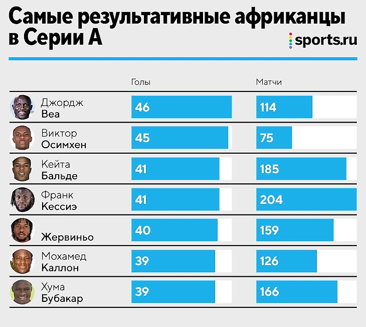 Пройдет еще немного времени, и нигериец Виктор Осимхен станет самым результативным африканцем в истории Серии А. Сейчас у него 45 голов. Джордж Веа опережает его всего на один мяч.