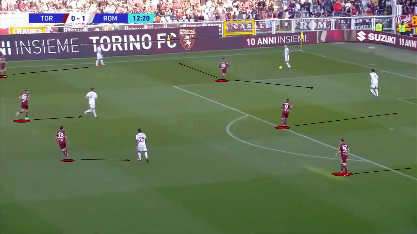 Особенность тотального персонального прессинга «Торино» в том, что он не нацелен на обязательный высокий возврат. В обязанности атакующей тройки не входит плотная работа по оппоненту – только перекрытие линий паса. Борьбу навязывают опорники и латерали. Вязкость нарастает по мере продвижения, провоцируя отказ от коротких вертикалей и долгих горизонтальных розыгрышей: соперника настойчиво подводят к неподготовленным переводам в переднюю линию.