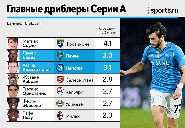 Еще двое блистают в Апулии. 22-летний Ламек Банда шесть лет назад работал на замбийской стройке, в 2019-м попал в тульский «Арсенал» и после нескольких ближневосточных аренд оказался в «Лечче». Сейчас у него 2 + 4 в 13 матчах. В игре с «Фрозиноне» он сделал 10 обводок – рекорд сезона.