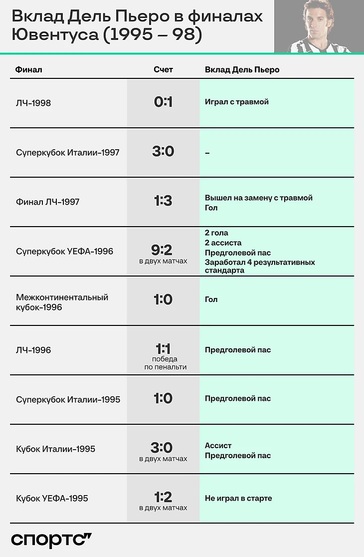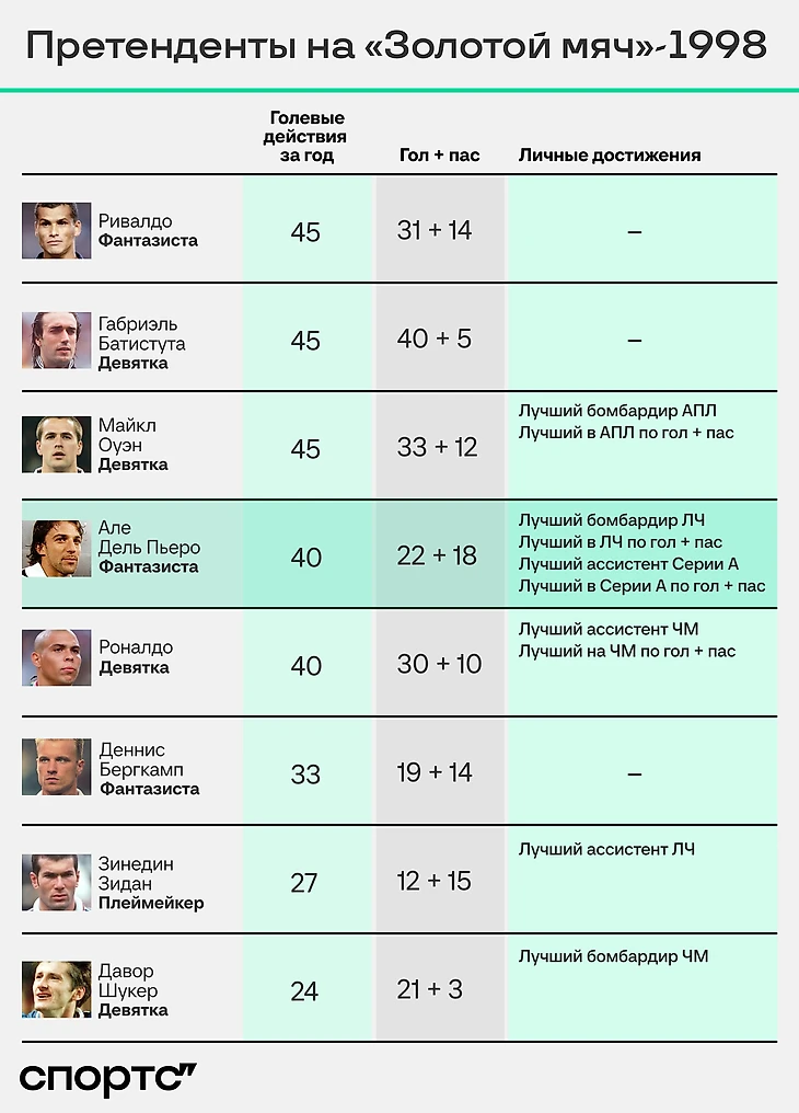 Летом 1998-го туринская La Stampa подытожила сезон традиционным командным рейтингом. Дель Пьеро финишировал первым. Пиппо – вторым. Зизу замкнул пятерку.