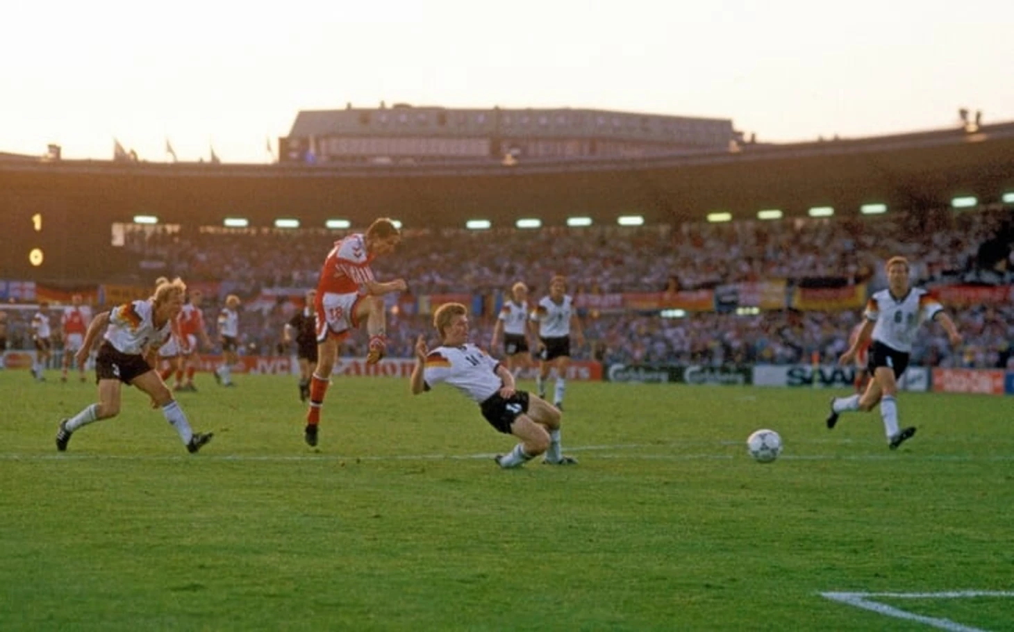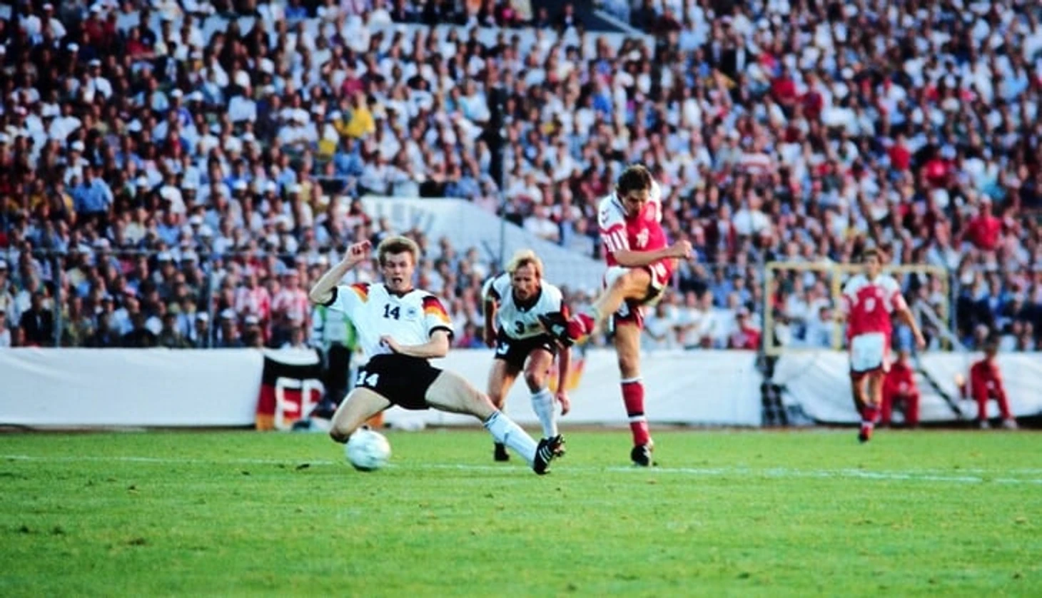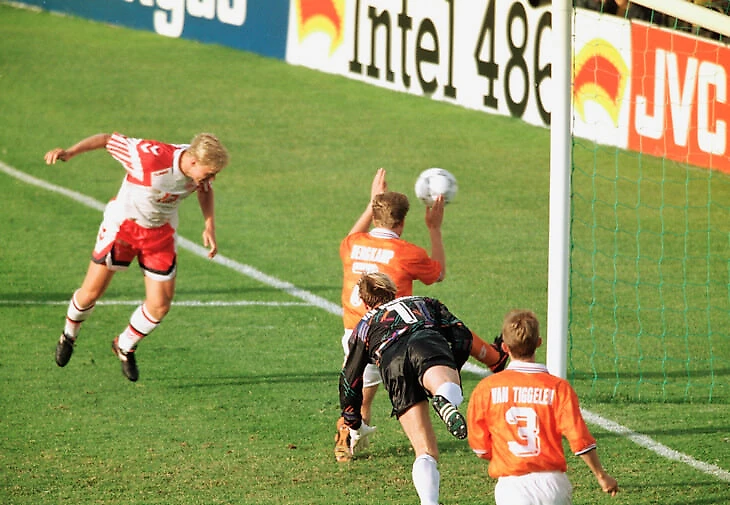 Ключевой момент датской сказки на Евро-1992: финал с Германией, которая проигрывает с 19-й минуты (забил Йон Йенсен), у немцев куча моментов, но Петер Шмейхель спасает. Наступает 79-й минута, Ким Вильфорт получает мяч, раскачивает двух защитников, смещается влево и бьет. Мяч попадает в сетку от штанги.