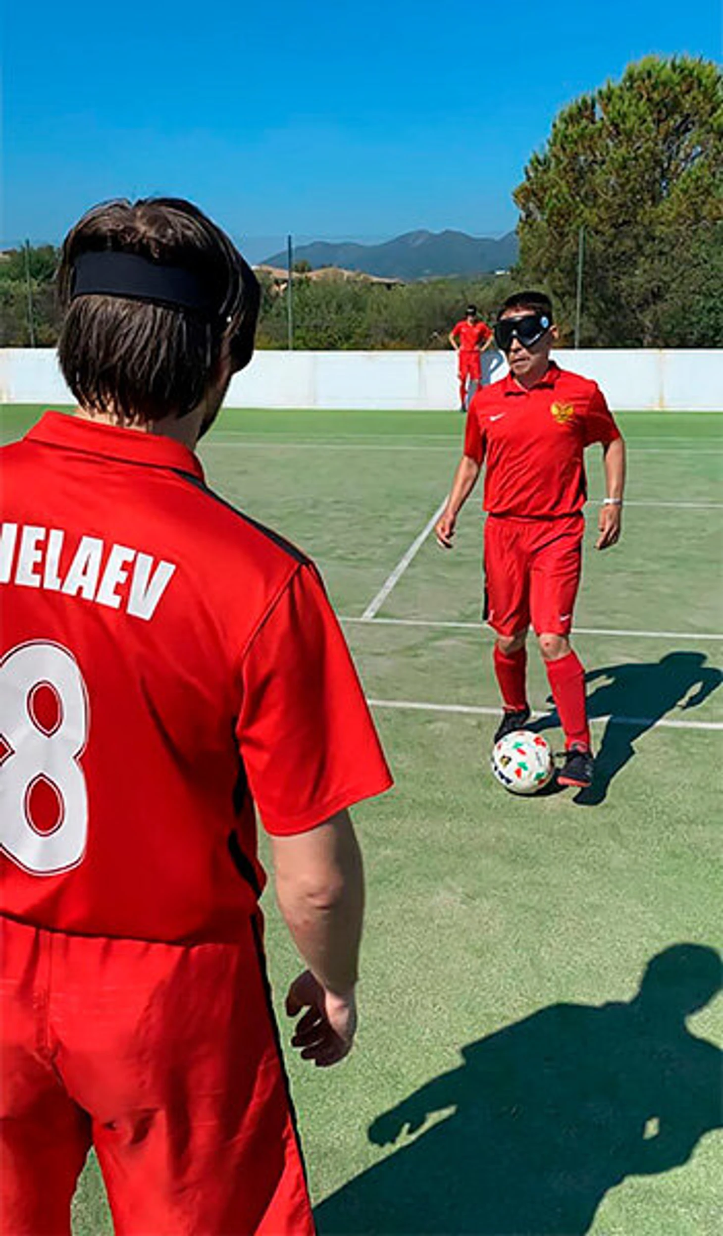 Это сочетание большого футбола и мини-футбола. Матчи проходят на искусственном газоне, а размеры площадки – 40 на 20 метров (как в мини-футболе). Она ограничена бортом – и чтобы мяч не уходил, и чтобы было проще ориентироваться. Недавно для зрелищности увеличили ворота: вместо 3 на 2 метра (как в мини-футболе) стало 3,66 на 2,14 (как в хоккее на траве). В футбол для слепых играют специальным мячом – он гремит, когда катится. Игроки выступают в светонепроницаемых очках, чтобы те, у кого есть остаточное зрение, не подглядывали.