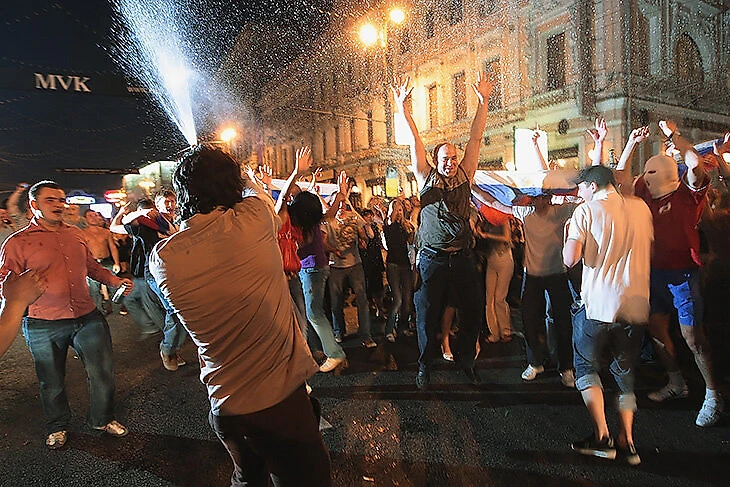Около 110-й минуты мы вышли в центре, где-то возле Инженерного замка. Радио было у меня, и мы услышали гол Аршавина. Я уверен, что в тот момент был самым громким на пять километров вокруг – я просто бегал, обнимал прохожих (и они радостно обнимались в ответ), кидал сандали в воздух, как и друзья по радионесчастью в автобусе. После финального свистка нас не смогли загнать в автобус, да и ехать он почти не мог из-за количества народа на улицах.