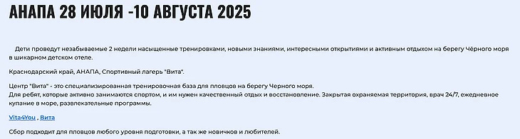 На базе «Виты» как минимум два лагеря – Mad Wave Camp и «Плывут. Дети» – проводят летние сборы для детей, занимающихся плаванием.