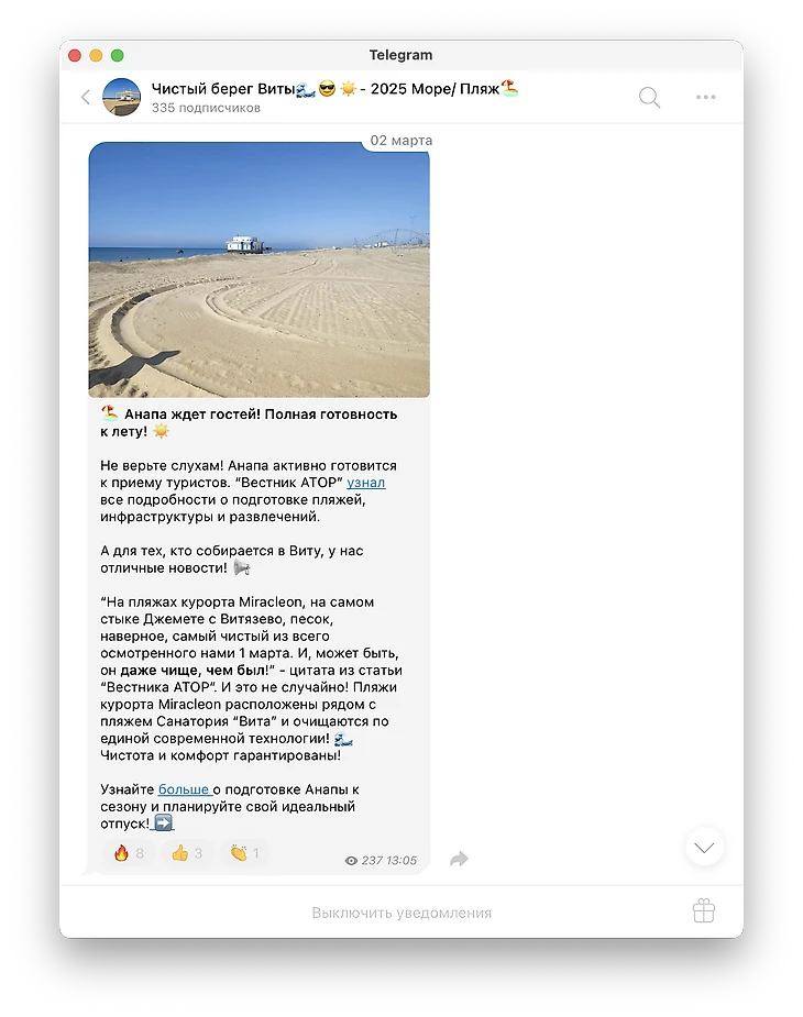 3 февраля в телеграм-канале Ассоциации Туроператоров России вышел пост под заголовком «Бензапирен в песках Анапы»: химические факты и странности публикаций в СМИ», 5 февраля – еще одна публикация, в которой, в частности, есть такие слова: