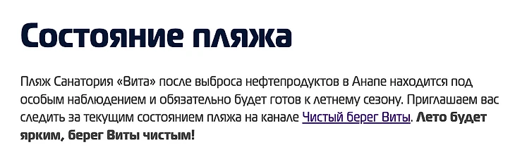 Однако это не означает, что мы не мониторим текущую ситуацию с состоянием пляжа санатория. С самых первых дней этого ЧП мы находимся на связи с руководством санатория «Вита».
