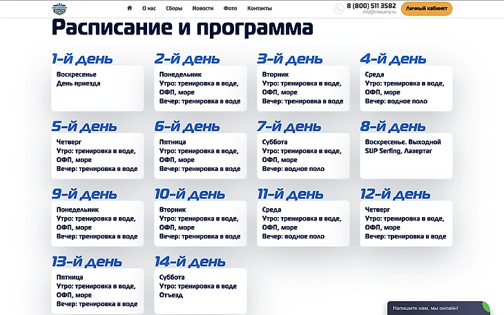 Родителям мы достаточно четко все проясняем, никого не вводим в заблуждение: на сайте – примерное расписание. В договорах с клиентами не прописано обязательное купание в море или посещение пляжа. Это решается на месте в зависимости от обстоятельств. Обязательной частью сбора является тренировочная программа в воде и на суше, и она будет выполнена в полном объеме.