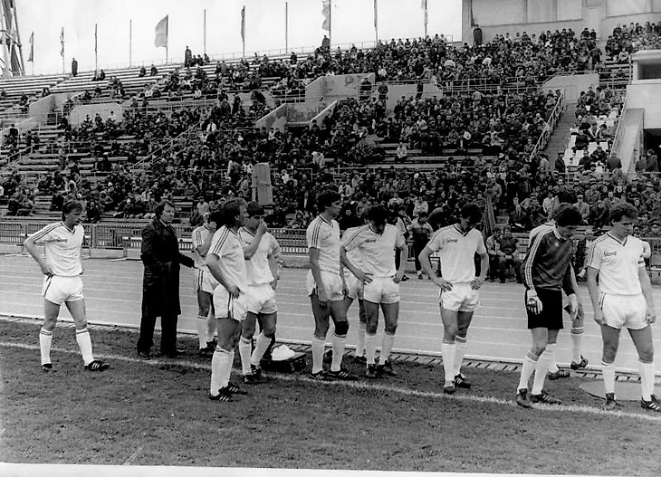 На фото старший тренер «Днепра» Евгений Кучеревский выражает своим подопечным недовольство их игрой. Что и не удивительно. В промозглый день 27 мая 1987 года у днепрян ничего не клеилось впереди. Они еле-еле сдерживали атаки московских динамовцев. Поэтому и отчитывает Кучеревских своих хлопцев в перерыве, чему стали свидетелями 6 500 зрителей на стадионе «Динамо». Почему мало? Так холодно резко стало в Москве. Всего 8 градусов после жары. О чем, впрочем, я уже писал ранее.