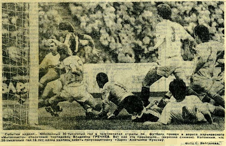 На четвертом фото запечатлен исторический момент в истории советского футбола – как забивался 30-тысячный мяч чемпионатов СССР. Хотя, его еще раньше вполне мог провести Юрий Савичев. Только вот автор «золотого» олимпийского гола Сеула-1988 не воспользовался подарком харьковских защитников. Да и Владимира Маслаченко с его эмоциональными «Ну, Савичев, убегай, забивай, я тебя умоляю!», не было.