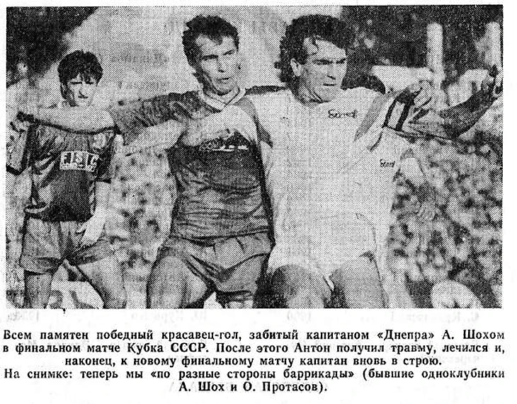 Но, прежде всего событие – это выход против «Днепра» на родном стадионе его бывших лидеров Геннадия Литовченко и Олега Протасова, который на заглавном фото ведет бескомпромиссную борьбу с выздоровевшим Антоном Шохом. В 1988 году по «этическим соображениям», как писали газеты, эта сладкая парочка не вышла в составе киевского «Динамо» на «Метеор». Правда, в Киеве оба сыграли. Но уж больно как-то странно Протасов транжирил момент за моментом, несколько раз запоров выходы один на один с вратарем Сергеем Краковским. 11 октября 1988 года хлопцы Лобановского дома одолели «Днепр» (2:0), что, впрочем, не помешали именно команде Кучеревского стать чемпионом. Победили динамовцы и 27 марта 1989 года (1:0). Теперь пришла очередь выигрывать «Днепру», который не мог этого сделать в матче с киевлянами ровно два года и один день. Я не знаю, как отнеслись трибуны к появлению на поле Литовченко и Протасова, потому что по телику этого не было видно. Скажу только, что в любом случае Лобановскому было не до сантиментов. Если в каждом матче «по этическим» соображениям не выпускать футболистов, которые раньше защищали цвета команд-соперниц, то тогда Валерию Васильевичу почти в каждом матче пришлось бы видоизменять состав. Особенно в поединках с украинскими клубами.