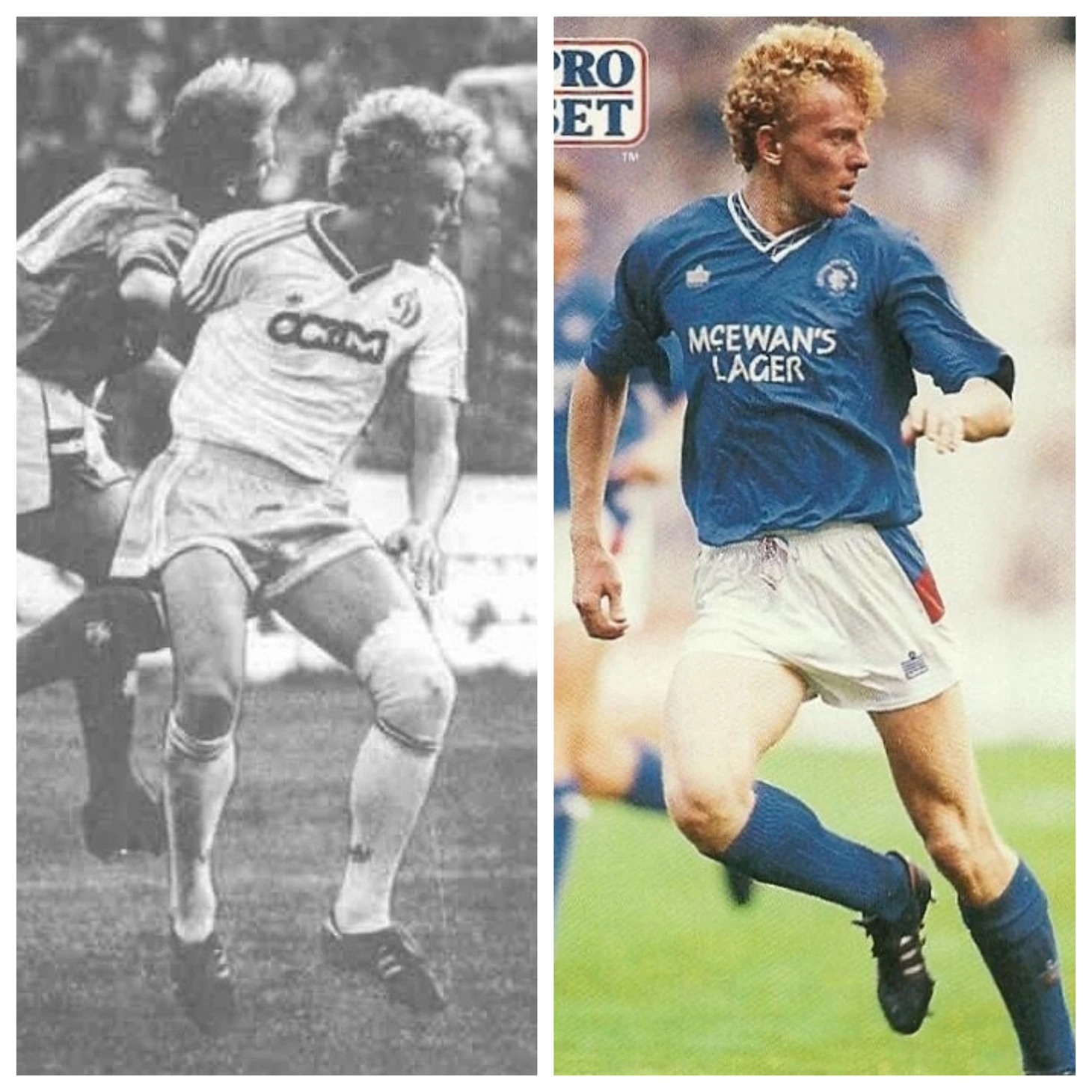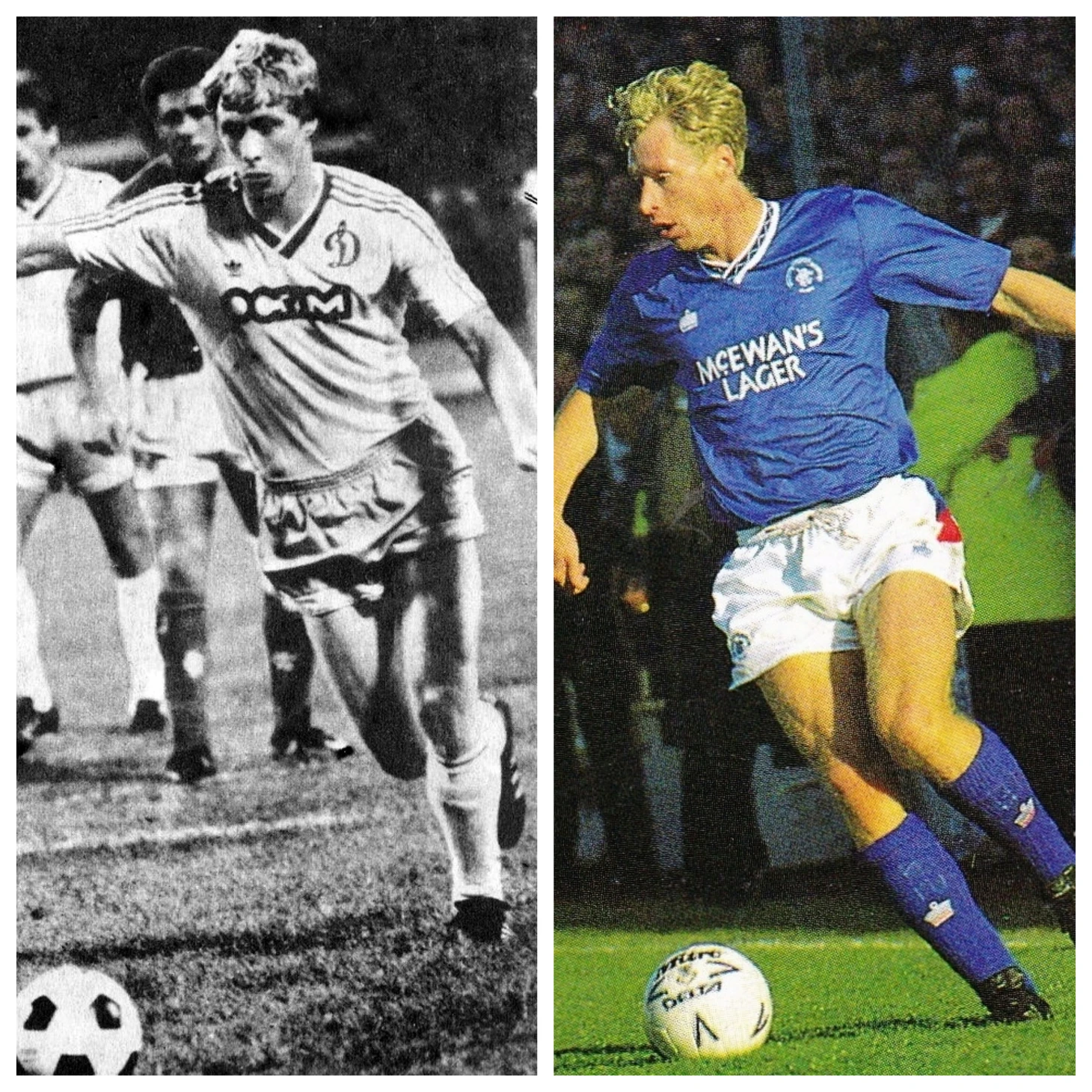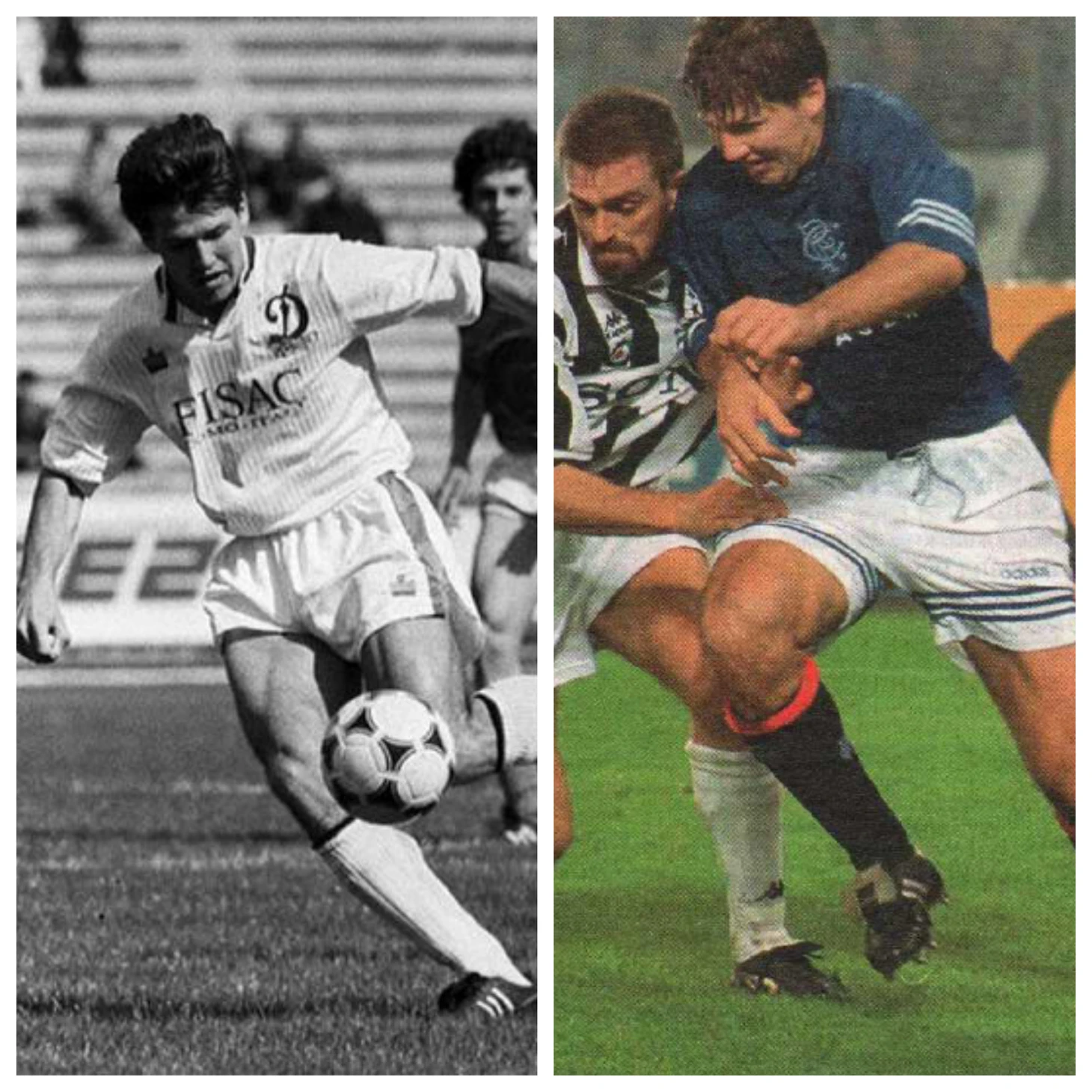 Кстати, на коллажах – крайние слева фото оба фигуранта «рейнджерского дела» как раз сражаются с рейнджерами в первом матче 1/16 финала Кубка чемпионов 1987/1988. Миха за секунду до успеха после реализованного им в Киеве пенальти. Правда, домашних 1:0 все равно не хватит для общего успеха, как так в Глазго последовало – 0:2. Правда, там без подлости шотландцев там не обошлось. Но это другой разговор.