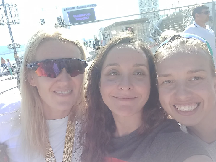 Плавание было комфортным, прозрачная вода, нет волн. Но впервые за 15 стартов я... не увидела второй буй. Просто не видела, где он, куда плыть! Пришлось чаще ориентироваться, поднимать голову из воды и ловить взглядом взмахи рук сильных соперниц впереди. На них и шла.