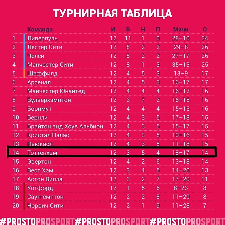 "Тоттенхэм" очень неуверенно стартовал в АПЛ. Они набрали только 5 очков за первые четыре игры, для топ-клуба это ужасный показатель. Дальше лучше не стало, череда неудач продолжилась... В следующих 8 матчах "шпоры" 2 раза победили, 3 раза сыграли вничью и 3 раза проиграли. Как итог – после 12 туров "Тоттенхэм" занял 14-ое место. Еще, можно добавить, что лондонцы вылетели из кубка Лиги в 3-м раунде.